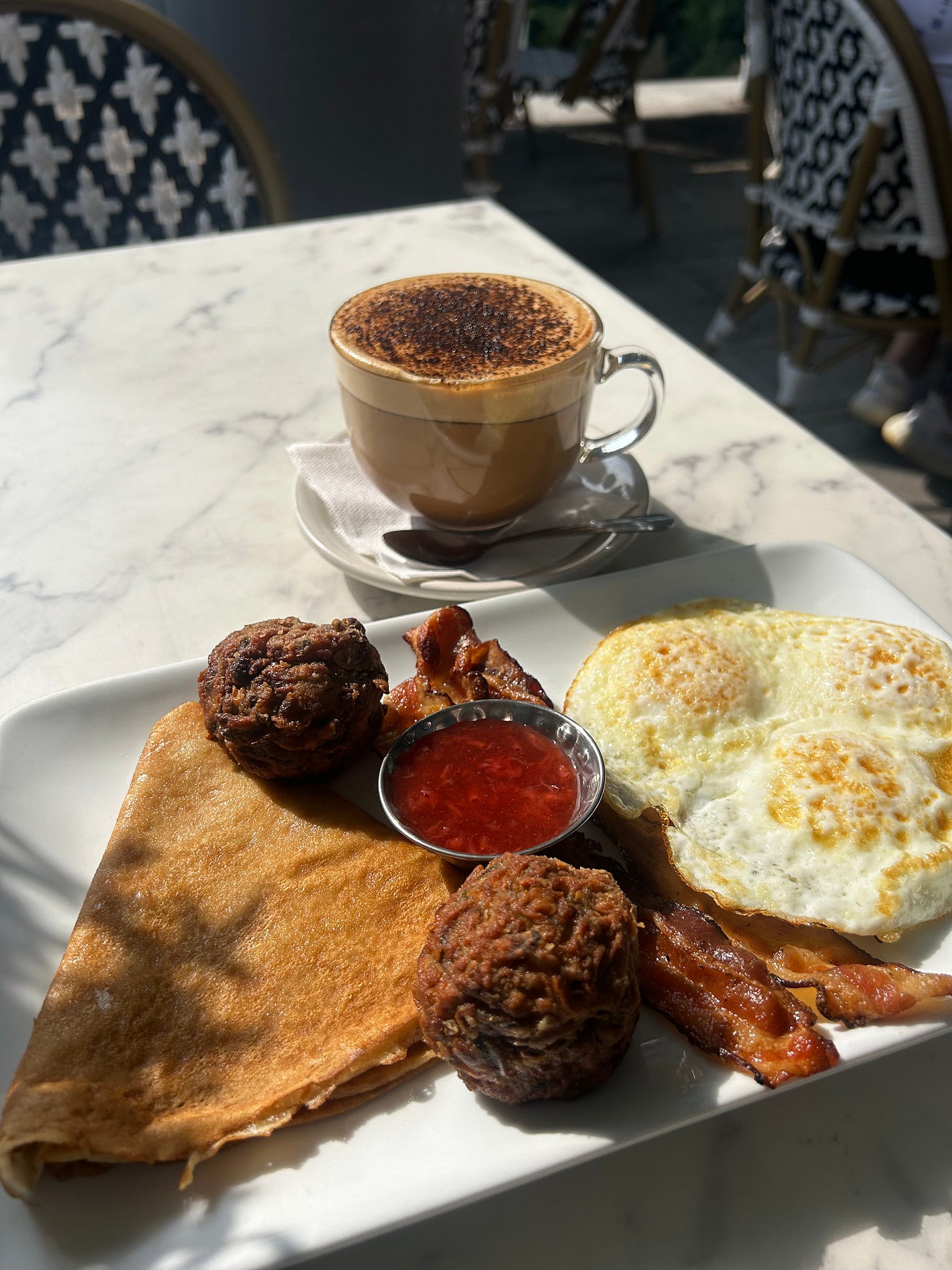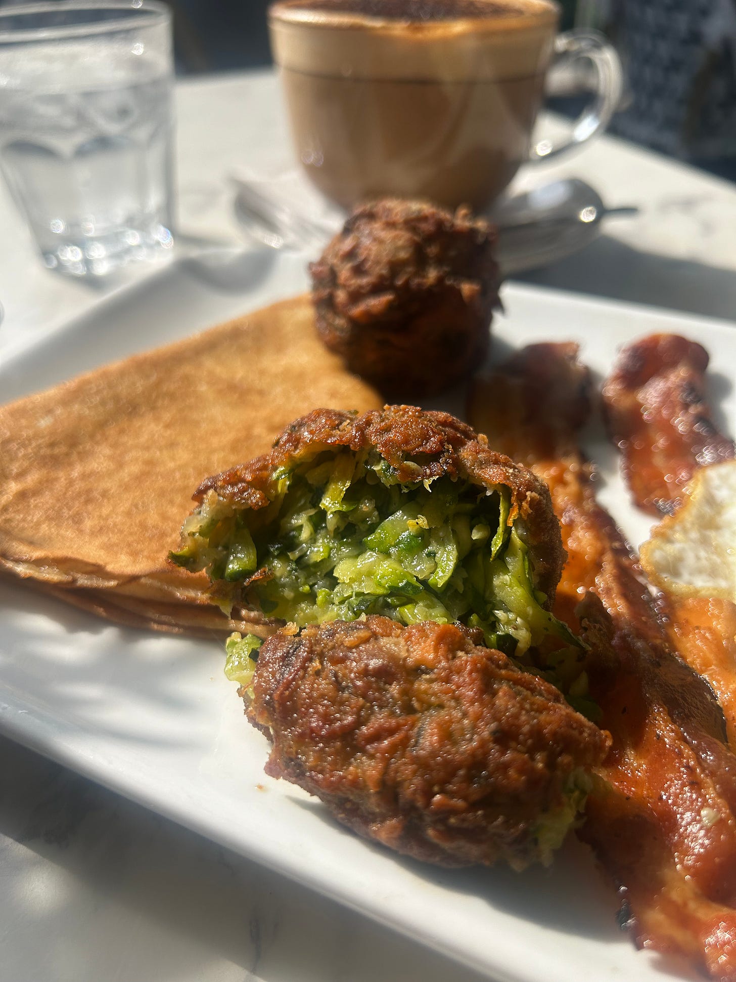 Once I had the menu open, I breezed through the decently sized menu. I contemplated changing my mind from what I originally came here to order. The sandwiches were enticing and the array of sweet, dessert-like crepes distracted me before I came to my senses. Zucchini hashbrown. These delicious morsels were the whole reason for my Wednesday morning walk to the café. While I distractedly remembered the zucchini hashbrown from my previous visit the server came over with a cool glass of water. He did not stop to take my order. With this interruption from memory lane, I refocused my attention, quickly deciding on the three eggs with bacon.